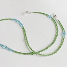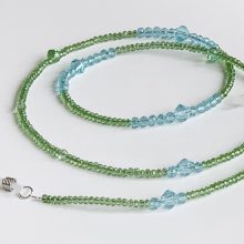 Brillenkette mit Perlen in grün und blau, am Ende gibt es kleine Silikon-Schlaufen, um die Kette an der Brille zu befestigen, Länge mit Schlaufen ca. 68 cm.