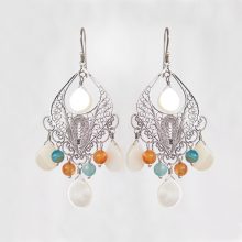 Filigraner in Wirbeln gestalteter Ohrring, silber oxidiert, verziert mit Anhängern aus gelber, grüner und blauer Jade. Aussen und in der Mitte hängen weiße Muschelplättchen.