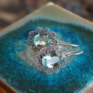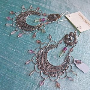 Filigraner Ohrring, silber oxidiert mit einer champagnerfarbenen Perle,